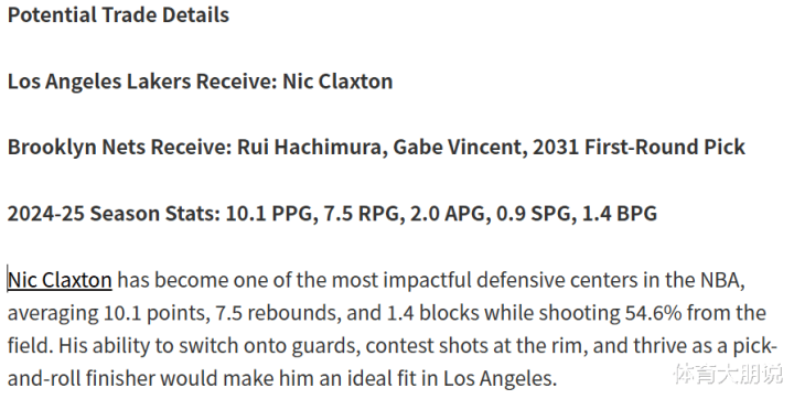 本赛季的尼古拉·克拉克斯顿已成为 NBA 最具影响力的防守中锋之一,场均10.1分7.5篮板1.4盖帽,投篮命中率为 54.6%。考虑到篮网未来的动向,尽可能收集选秀权,届时湖人可以用较为合适的价位,推进交易的完成。八村壘、文森特以及2031年的首轮选秀权,作为筹码,恐怕届时的篮网并不会选择拒绝。